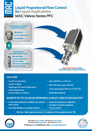 Do you need to vary the flow of fluids or gasses in your factory/application/product? Do you need something that is precise, repeatable, easy to control and with low hysteresis? Check out the MAC Valves PFC (Proportional Flow Control).